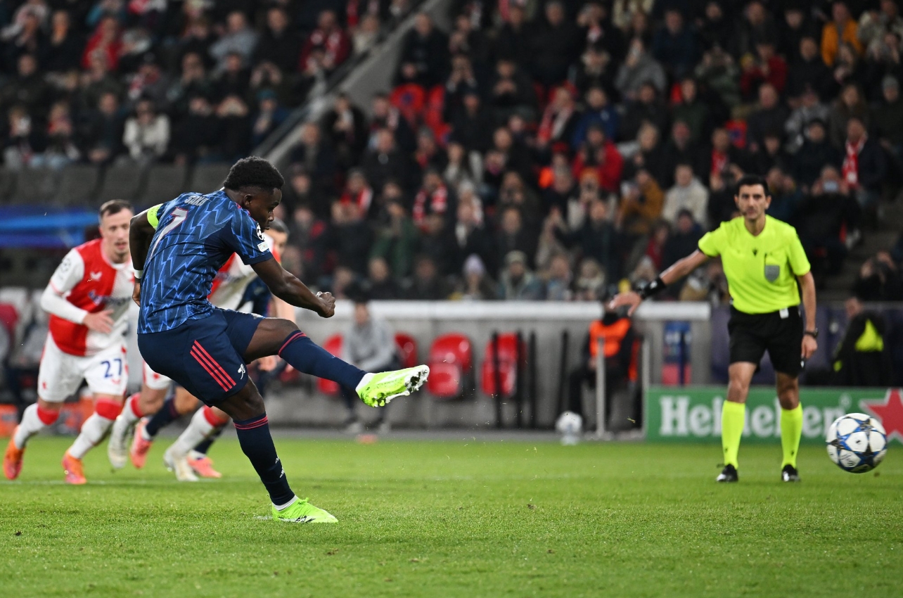 Slavia bermula dengan intensiti, tetapi Arsenal disusun, dengan Gabriel Magalhães semakin awal dan Bukayo Saka dua kali menguji Jakub Markovič. Pada 30 minit, Saka menukar penalti selepas tajuk Gabriel melanda tangan Lukáš Provod – disahkan oleh VAR.