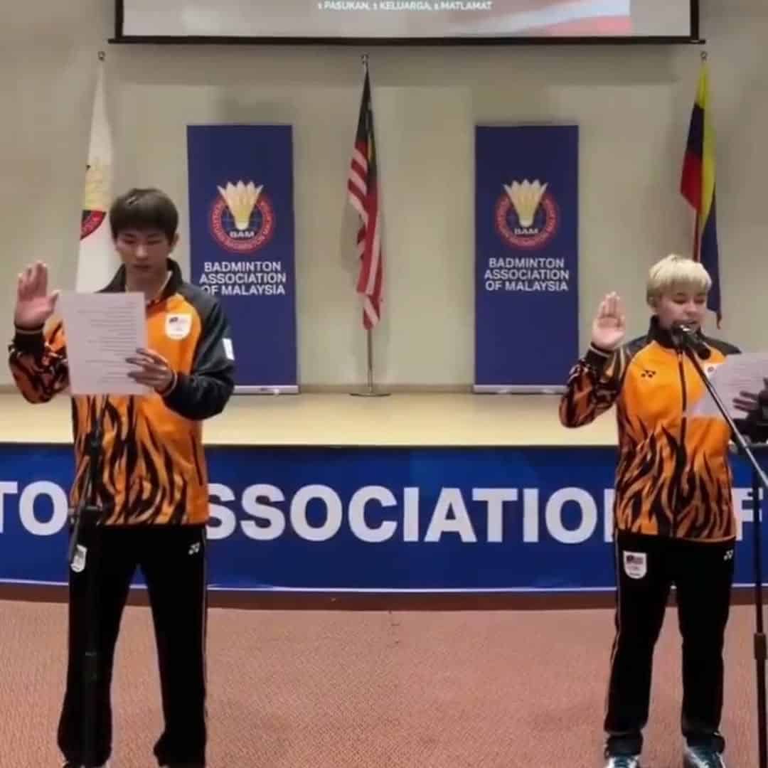 Chen Tang Jie dan Toh Ee Wei memimpin pasukan Badminton Sukan Laut Malaysia sebagai kapten semasa majlis pengambilan sumpah. (Bam)
