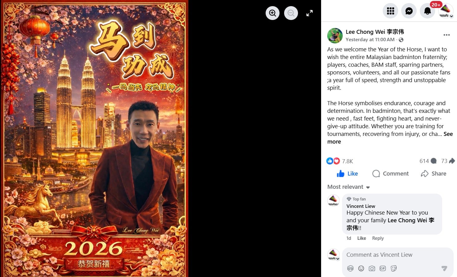 “Saya ingin mengucapkan Selamat Tahun Baru Cina kepada semua dalam keluarga badminton Malaysia. Semoga tahun ini dipenuhi dengan kepantasan, kekuatan dan semangat yang tidak dapat dibendung,” katanya.